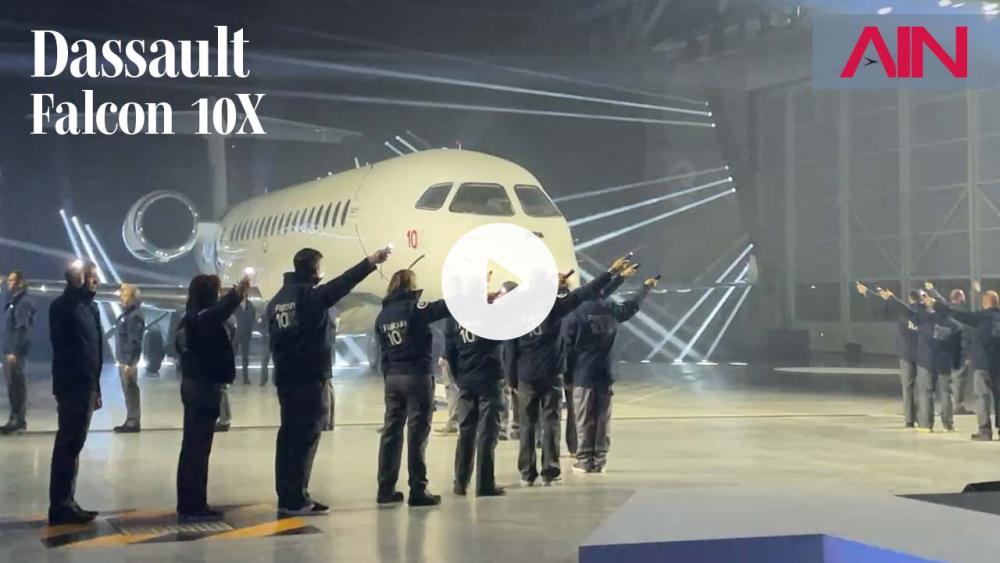 The Dassault Falcon 10X, with a range of 7,500 nm at Mach 0.95, made its public debut at its Bordeaux factory.
